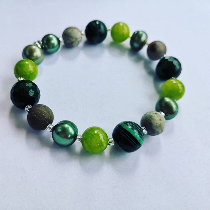 Unikalna bransoletka wykonana z kamieni naturalnych- m.in. agaty, jadeity, malachit oraz perły naturalne.