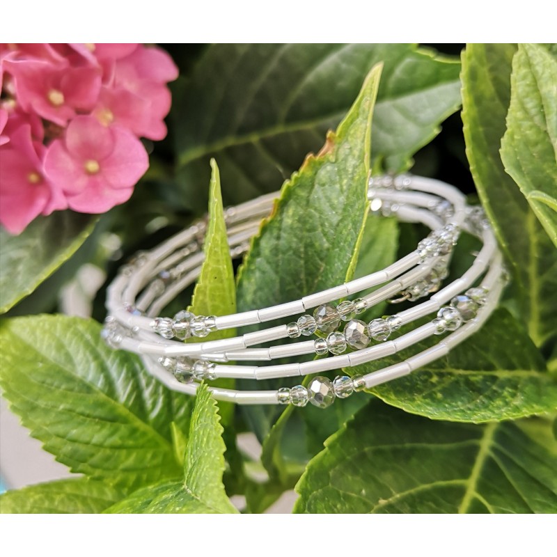 Unikalna i piękna bransoletka na każdą okazję! Kilkukrotnie okręcana wokół dłoni,wykonana z japońskich koralików mijuki w kolorze białym. Dodatek delikatnie szarych, czeskich kryształków preciosa nadaje jej pięknego błysku.