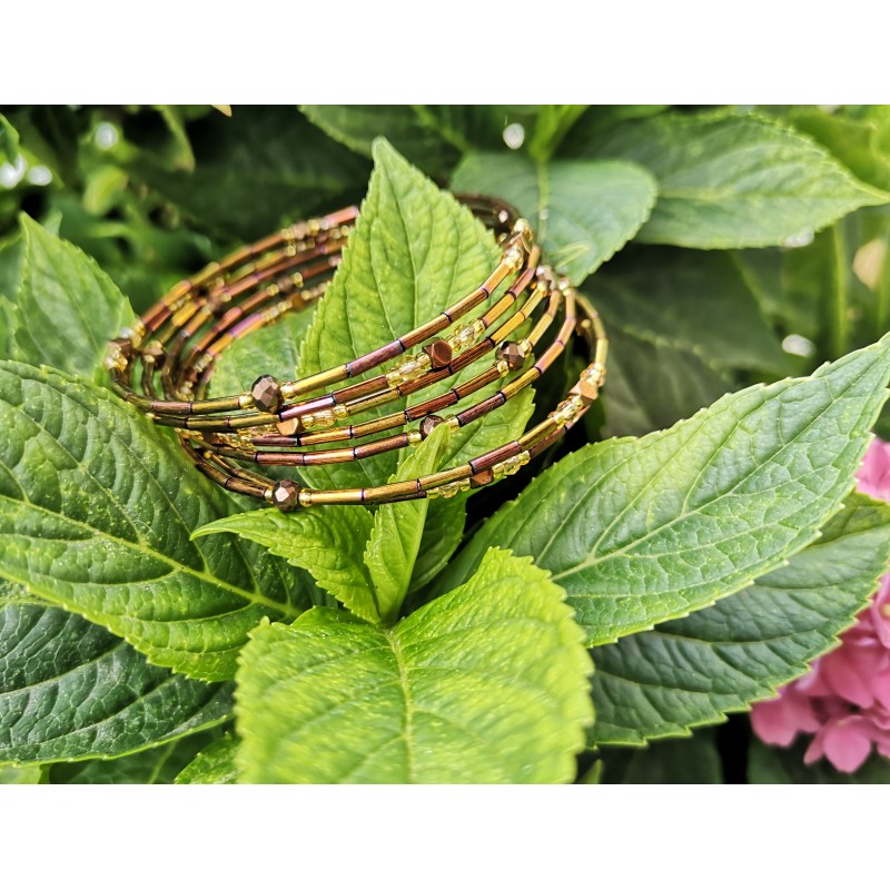 Unikalna i piękna bransoletka na każdą okazję! Kilkukrotnie okręcana wokół dłoni,wykonana z japońskich koralików mijuki w kolorze złoto-brązowym. Dodatek hematytu i czeskich kryształków preciosa nadaje jej pięknego błysku.