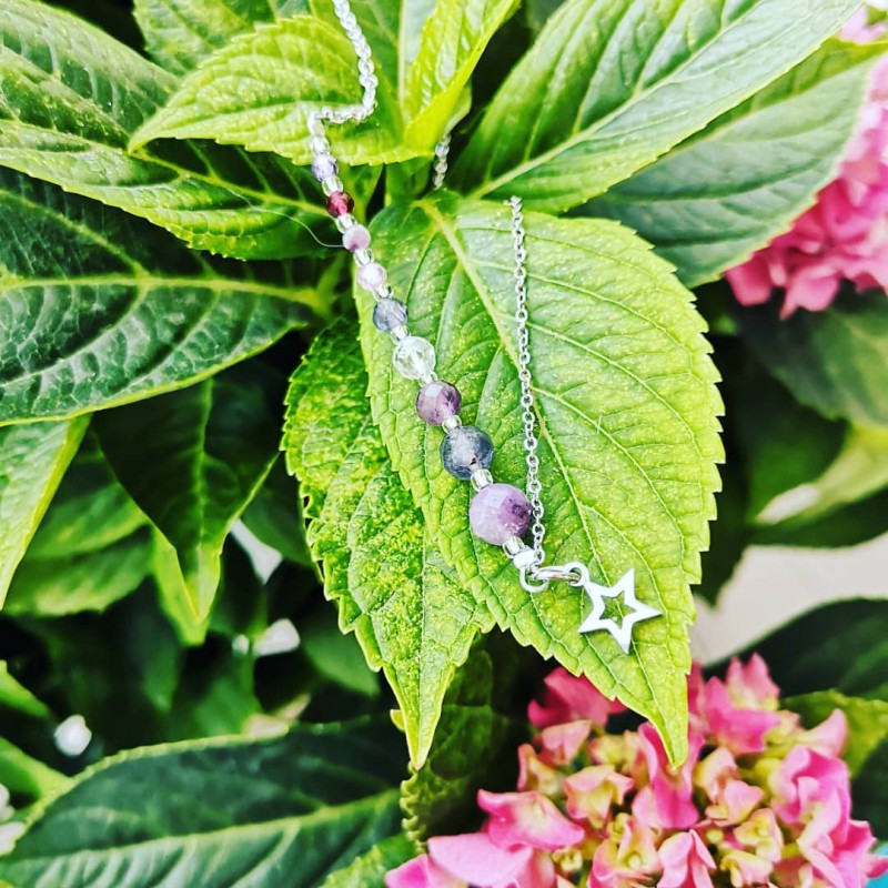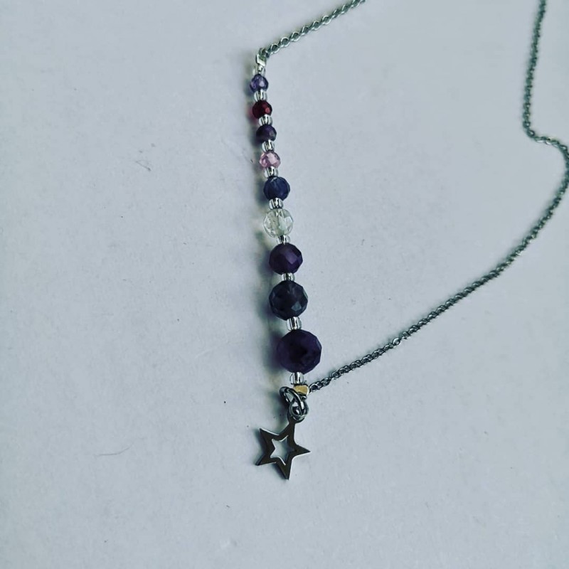Przepiękny i delikatny naszyjnik z drobnych kamieni naturalnych oraz stali szlachetnej. Kamienie w kolorze fioletu i różu idealnie komponują się ze srebrnym kolorem łańcuszka.